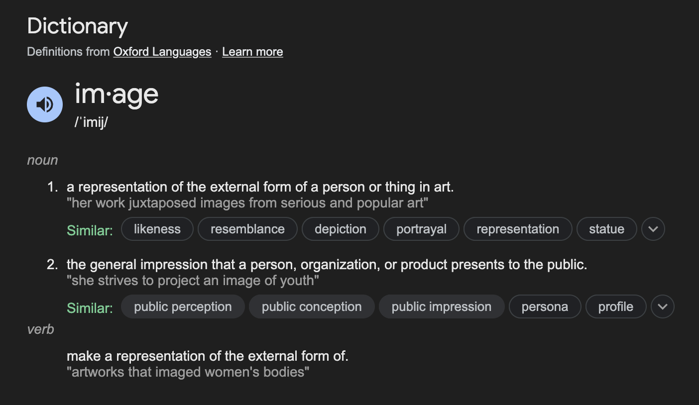 The word 'image' has latin origins and is closely related to the word 'imitate'. An image is defined as a representation of the external form of a person or thing. In other words, an image is a model of a thing or a snapshot of how a thing is perceived from a particular perspective; but what an image is not is the thing itself. I used to have the biggest crush on Zoe Saldana and used to collect images of her on my Tumblr and imagine one day meeting her and making her fall in love with me.